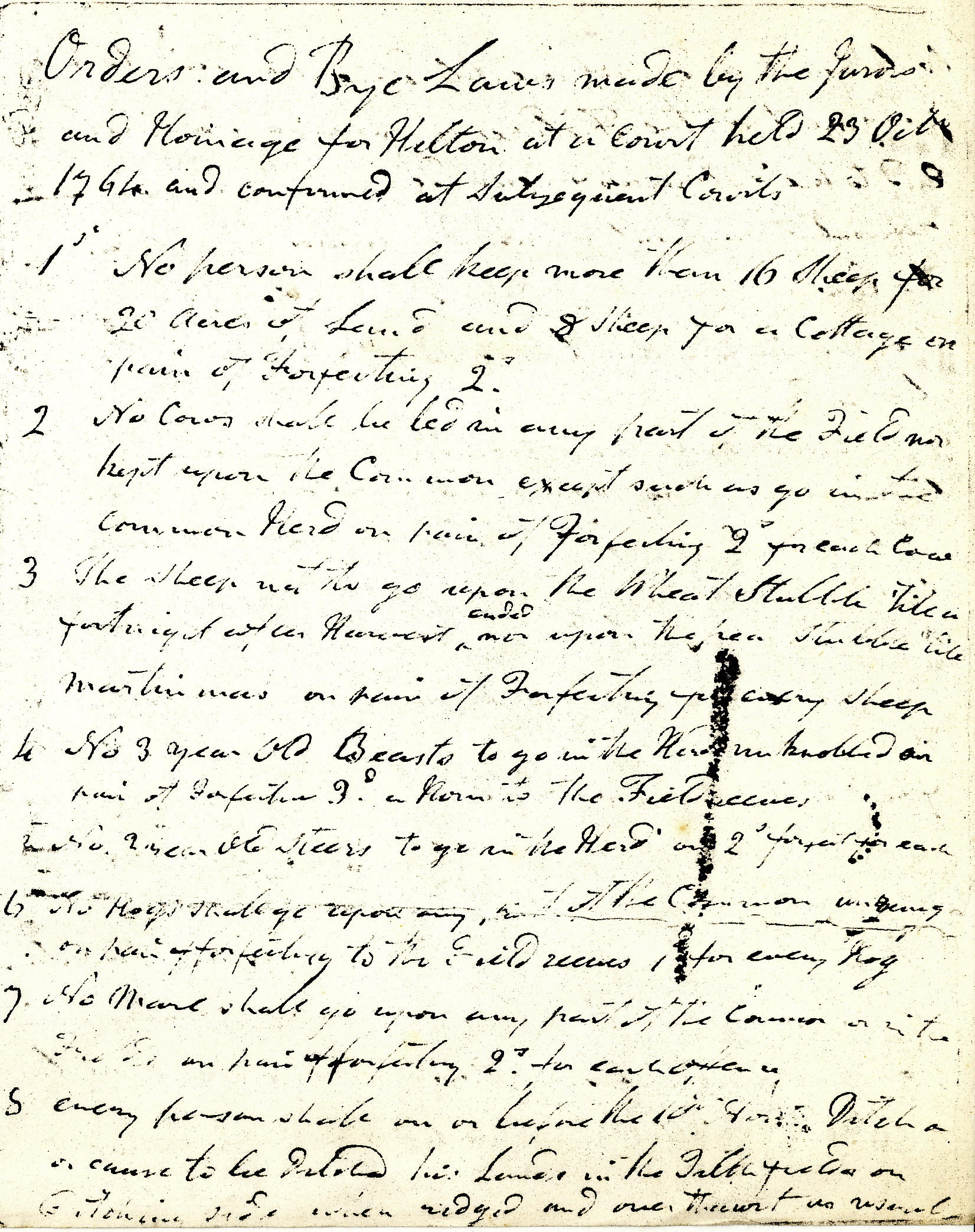 Orders and Byelaws made by the Jurors and Homage of Hilton at a Court held 23rd Oct. 1764 and confirmed at subsequent courts.
