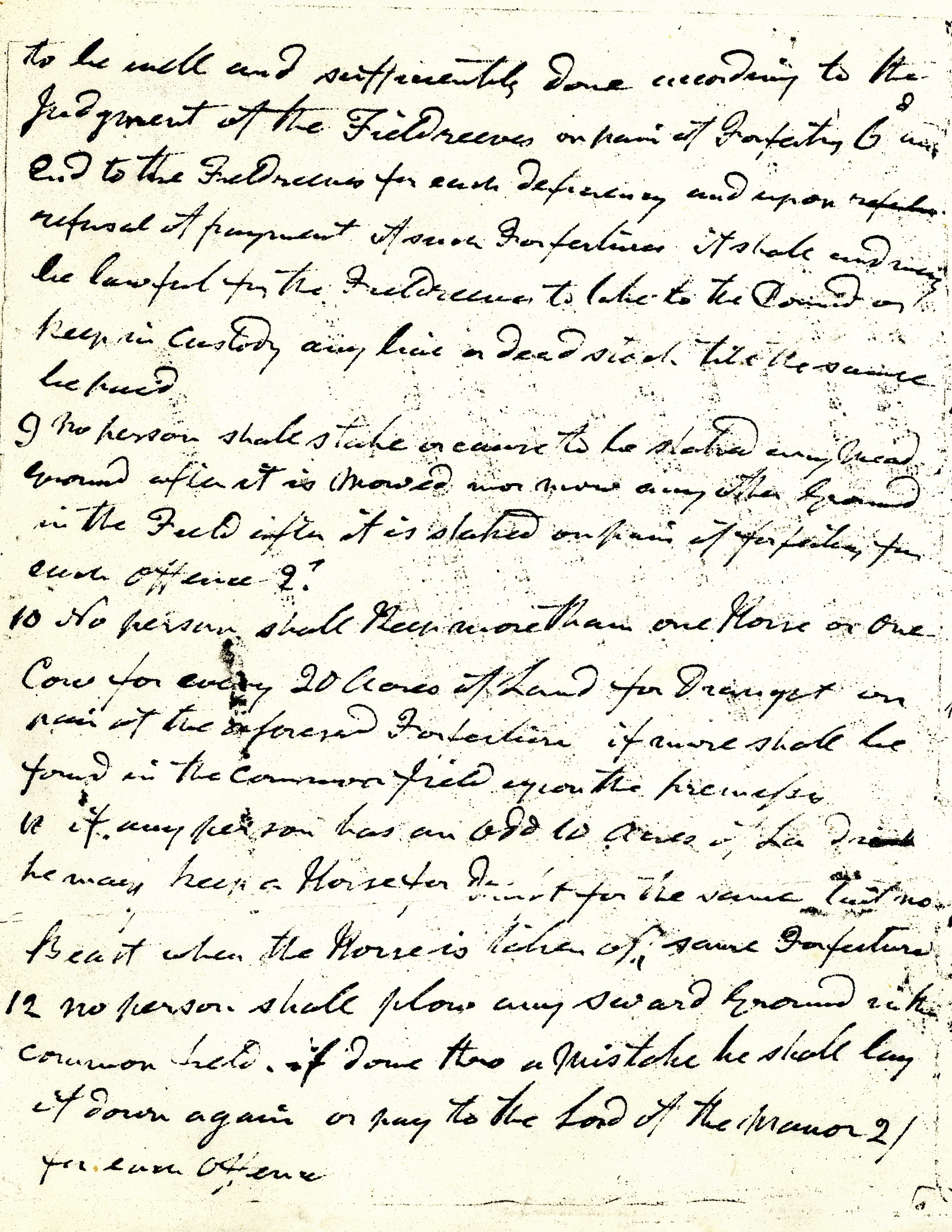 12. No person shall plow any sward ground withinthe common field, if done thro' a mistake he shall lay it down again or pay to the Lordof the Manor 2/- for each offence.