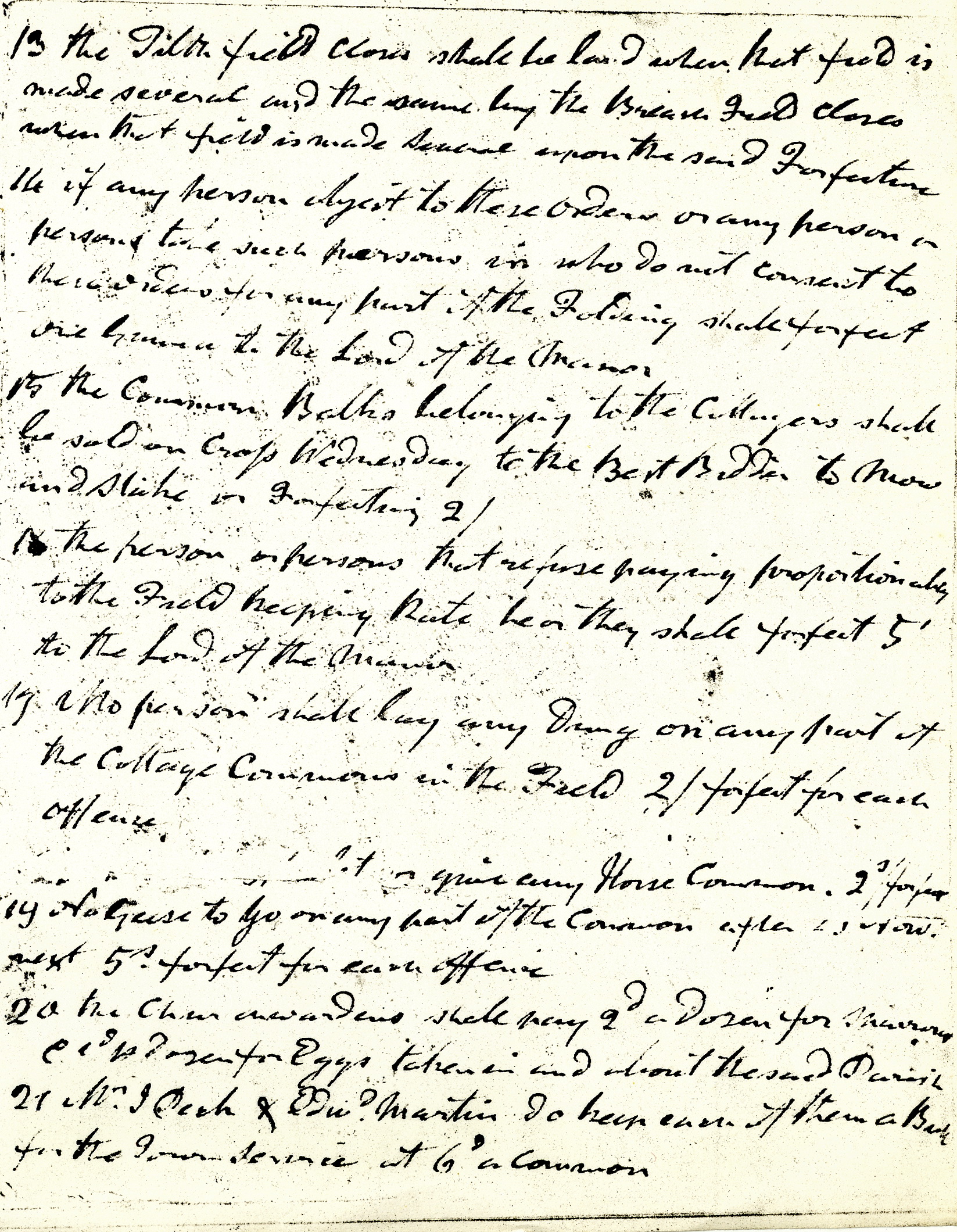 17. No person shall lay any dung on any part of the cottage commons in the field. 2/-forfeit for each offence.