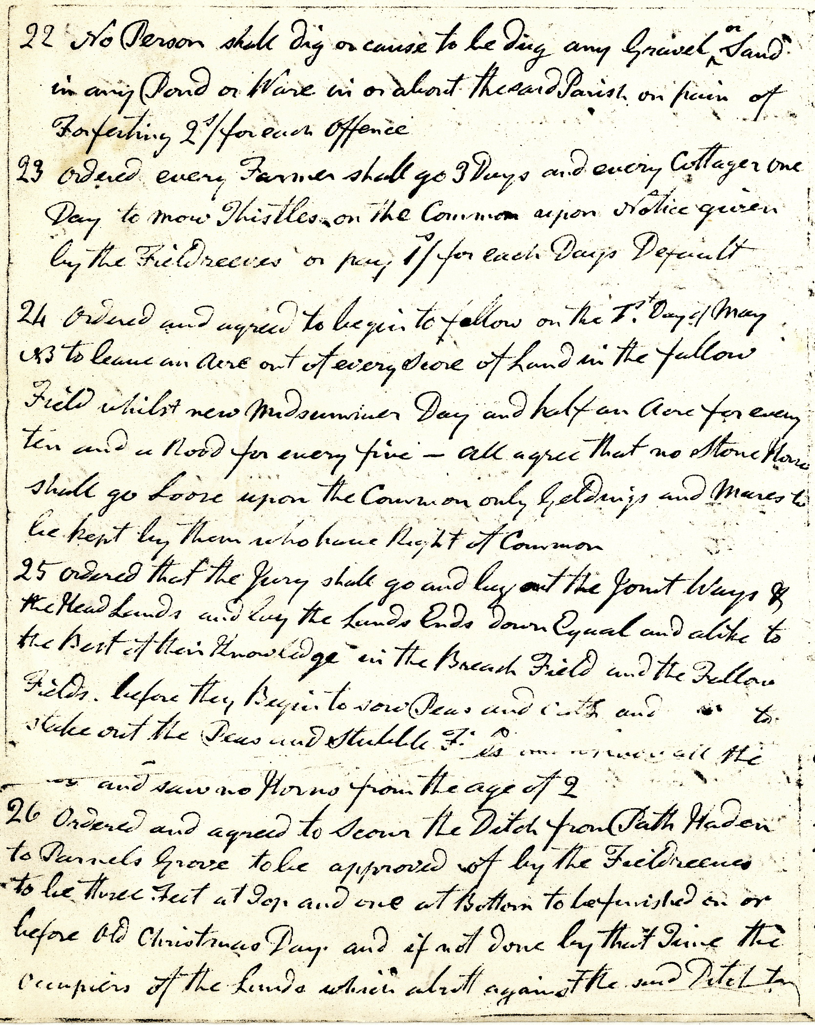 23. Ordered every Farmer shall go three days and every cottager one day to mow thistles on the common upon notice given by the Field reeves or pay 1/- for each days default.
